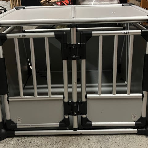 Et skikkelig solid og trygt bur for to hunder av middels størrelse (opp til ca 30 kg kroppsvekt). Buret er helt inntakt, og veldig fint brukt. Det har blitt oppbevart i bil eller innendørs til enhver tid. Selges for 4000,- (nypris rundt 8000,- avhengig av forhandler).