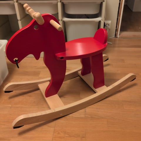 IKEA Ekorre gyngehest i rød farge laget av tre. Designet for barn, denne gyngehesten gir stabil lek og moro. Passer perfekt til barnerommet.