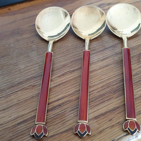 Tre sølv og emalje kakegafler / dessertgafler fra David Andersen selges samlet for 1500 kr. Lengde 13,5 cm. De er forgylte. I meget god stand. (Bildene viser fire gafler, men en er solgt.)