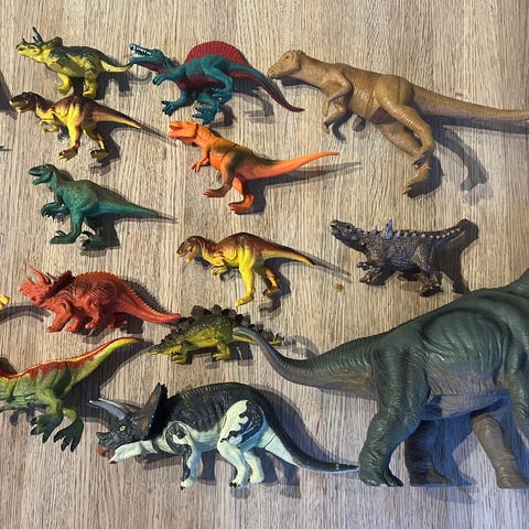 Fint brukt dinosaur pakke selges. Litt forskjellige typer som schleich, papo mm. I tillegg er det med en vulkan.