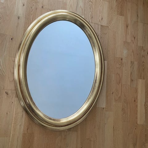 Rundt gullspeil, nydelige detaljer. Rammen er i plast.