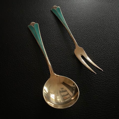 Tre flotte sølv og emalje dessertskjeer fra David Andersen selges samlet for 1500 kr. Lengde 13 cm. De er forgylte. To av skjeene er i god stand, men den tredje har en en liten avskalling bak.