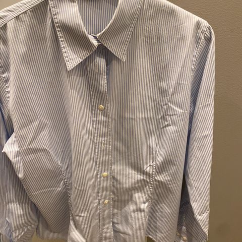 Sand skjorte, blå med hvite striper i 100% bomull. Str L (liten på str). Omkrets bryst ca 104 cm og lengde 69 cm. Pent brukt. Pris 350,-