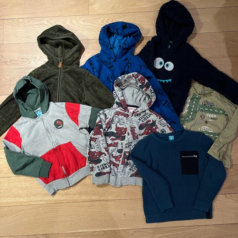 1 fargerik hettegenser str 146/152. (Brukt en del men mye bruk igjen)