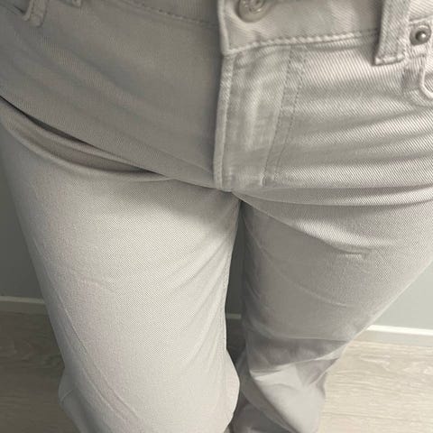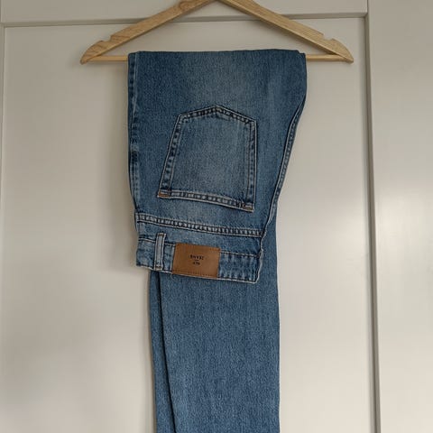 Pent brukte jeans fra Nelly sitt eget merket. Buksene er i en sort/grå vask og har en straight fit. Størrelse 38.