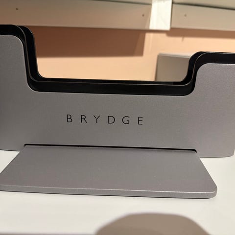Dette er en Henge Docks vertikal dockingstasjon, modell HD01VA13MBP, designet for 13-tommers MacBook Pro. Den er laget for å forenkle skrivebordsoppsett og gir rask plug-and-play integrasjon med eksterne enheter.