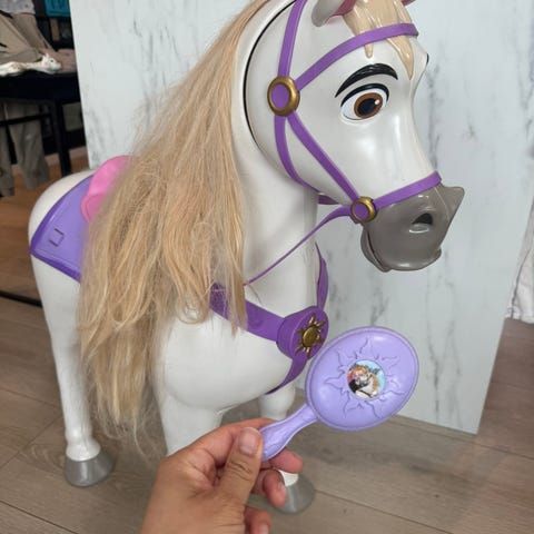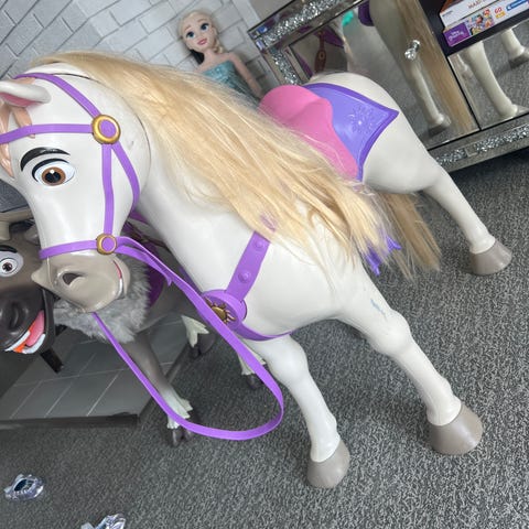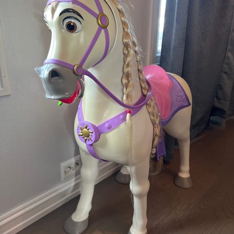 Selger denne kjekke Disney-hesten som lager lyd: vrinsker, tygger og galopperer. Stor nok til å sitte på opp til seks år.