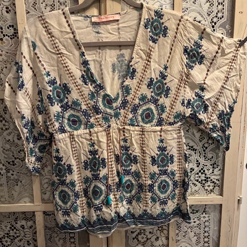 Veldig fin Inka mønstret boho-topp, kjøpt i Mexico. Perfekt til sommerens festivaler! Stoffet er i vevd bomull eller annet, en myk og behagelig kvalitet. One-size og passer alt fra str XS til M.