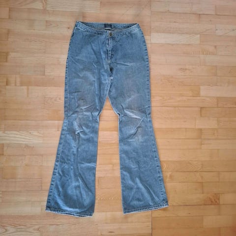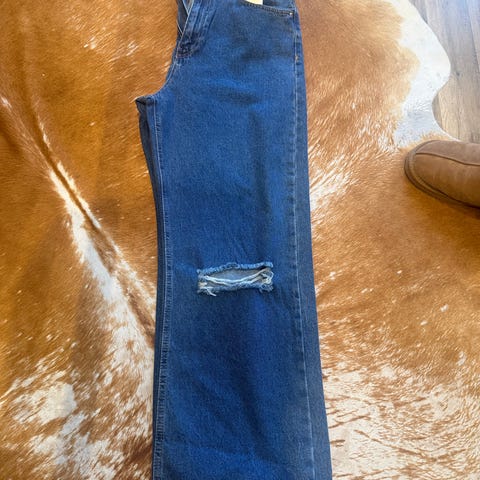 Mørkblå jeansfarge med "slitte" partier på lårene foran og bak.