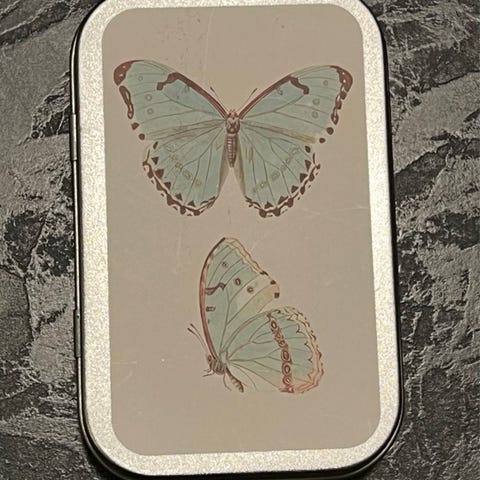 Serviett i metall med sommerfugler rundt. Pent brukt. Se mål på bilder. Hentes i Ski eller sendes mot betaling av porto.