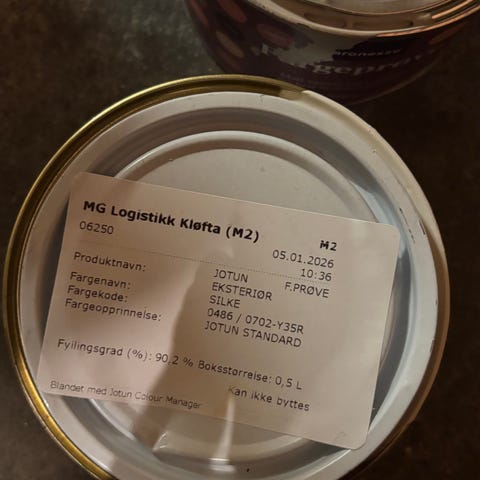 - 1 spann fra Pure and Original (samme fargekode som Macchiato - skal være samme glansgrad). I overkant av 1 l igjen