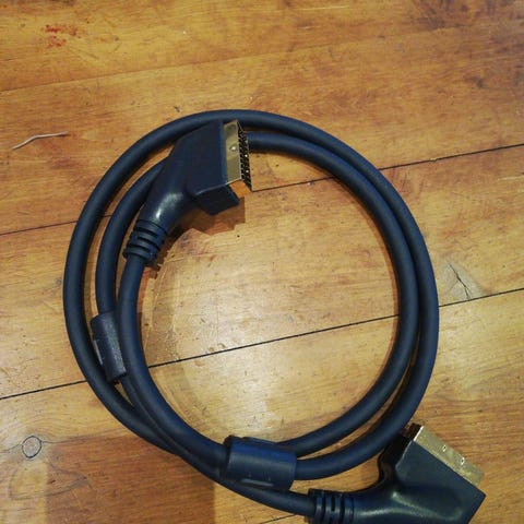 Selger en SCART-kabel, perfekt for å koble til eldre TV-er, videospillere, DVD-spillere eller spillkonsoller som bruker SCART-tilkobling. Kabelen er i god stand og sikrer stabil bilde- og lydoverføring for dine retro-elektronikk.