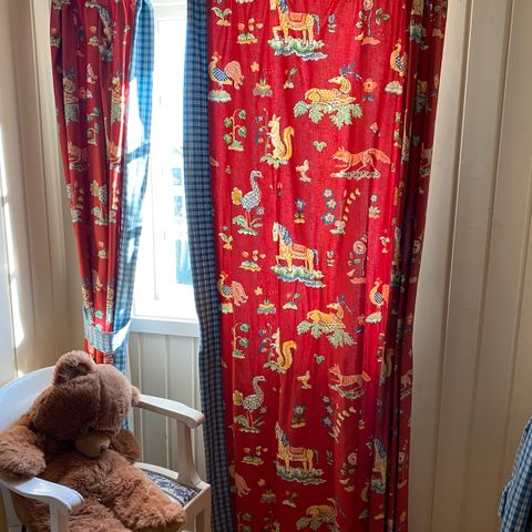 Et sett gardiner med løpegang til barnerom. Bredde 130 cm, høyde 127 cm.