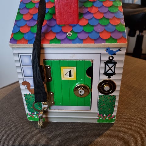 Melissa & Doug trehus med 4 dører, 4 ulike ringeklokker med ulik lyd, nøkler til alle dørene og 4 dukker i 4 ulike farger.