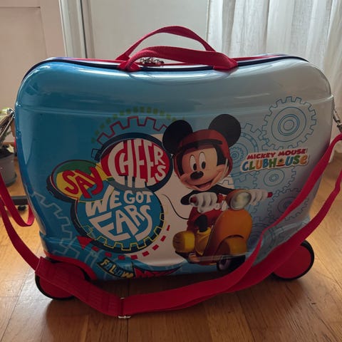 Stroppen til å dra kofferten etter seg ligger igjen i en charterbuss et sted i Hellas. Men festene på kofferten er fortsatt inn takt, så her er det bare for en kreativ mamma eller pappa til å finne løsninger.