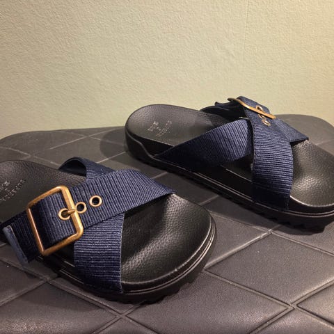Helt nye, kun prøvd å gått med inne, slippers, tå- sandal, flipp flopp, i str 42. Mørk blå, med vattert innersåle, lær- rem med logo. Disse er ute av sortiment, og stått i skap noen år, ubrukt. Veldig fine og god kvalitet for de som bruker slike sandaler.