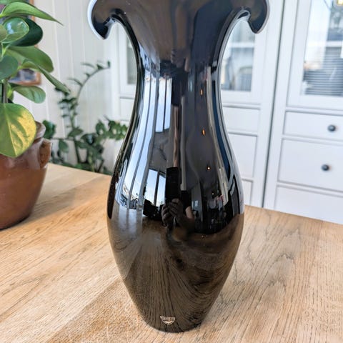 Fin, sort glassvase med slipt mønster selges for 200,-