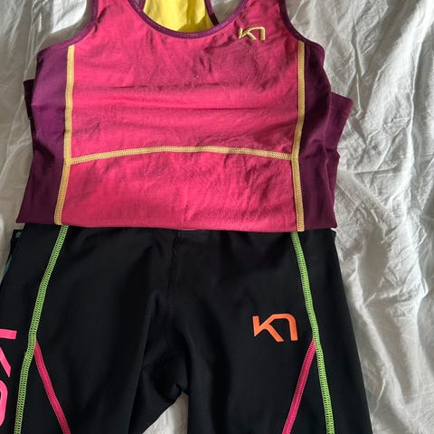 Pent brukt treningssett i svart/hvitt mønster. Topp i str. M og tights i str. L, men begge passer M/L. Behagelig stoff og god passform – perfekt til trening eller fritid.
