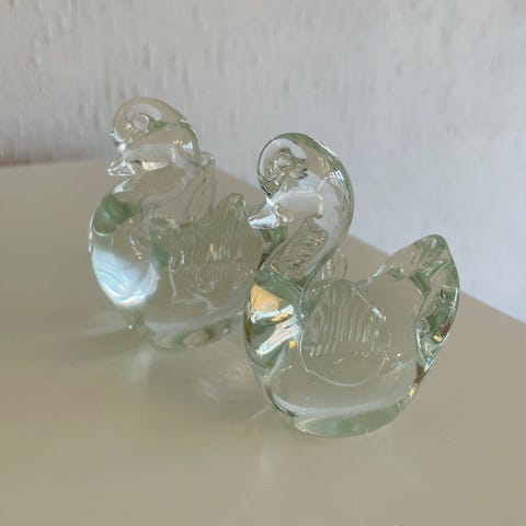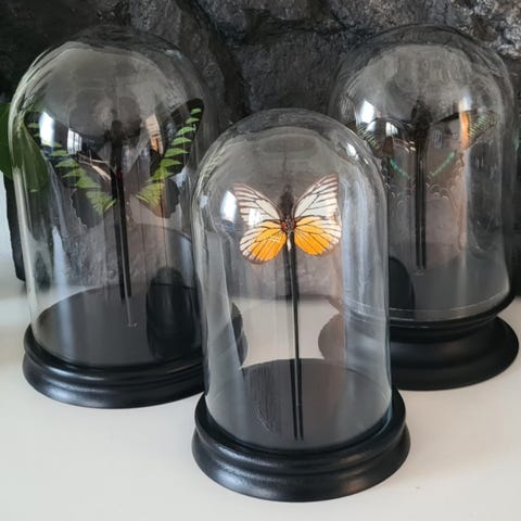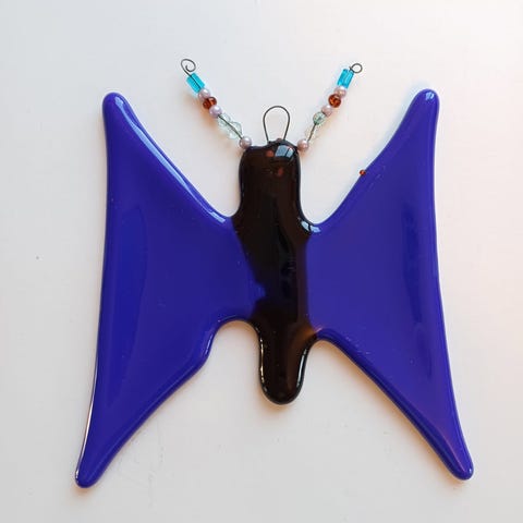 Nydelige sommerfugler i glass. Håndlaget. Har ikke navnet på glasskunstneren. Den største sommerfuglen er i rød og gul med gull. Ca 19 cm høy og 18,7 cm bredde øverst på vingene. Kr 170,- Den minste sommerfugl i lys grønn (gul) og blå. Ca 9,5 cm høy og bredden er øverst på vingene ca 9,5 cm kr 125,-. Kjøper du begge er prisen samlet kr 250,-