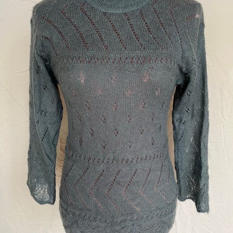 Kvalitet: 34% mohair, 34% ull, 27% polyamid, 5% elastan. Ullgenser i sterk gulfarge, den har halvhøy rund hals. Genseren er vanlig i størrelsen.