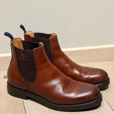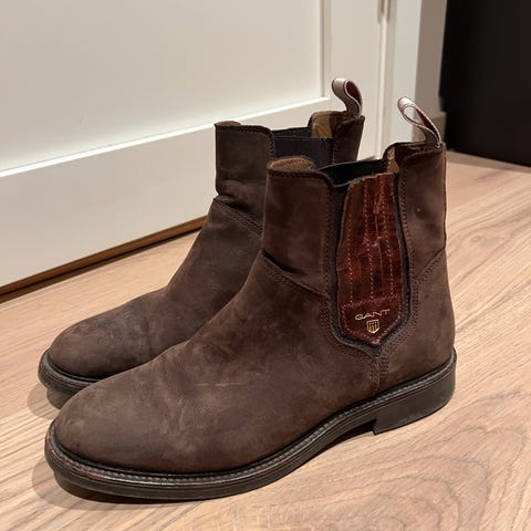 Gant. Boots i semsket skinn. Behagelige å ha på og passer til det meste. God kvalitet og har vært en stor favoritt.