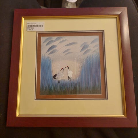 Dette er et brodert tranemaleri fra Suzhou i Kina, som er kjent for sine broderte bilder. 23*23cm. RMB 235 på bilde 4 er kinesisk valuta omgjort til 326 NOK.