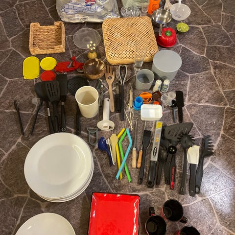 Her har du f eks, tallerkner, kopper, glass, bestikk, sil, måle begere i forskjellige størrelser, kaffe presse, ostehøvel, raspe, opptrekker, bake boller, kjeler, lokk, fjøler, visper, stekespader, gryte holdere/bord beskytter, sleiver, ild faste former, pizza skjærer, saks, oppbevaringsboks, drikke flasker, termoser etc etc..