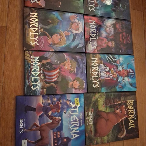 Nordlys 1-4 selges samlet til 600 kr. Nypris er 299 kr per bok. Bøkene er ikke synlig brukt, bortsett fra et lite merke på baksiden til første bok.