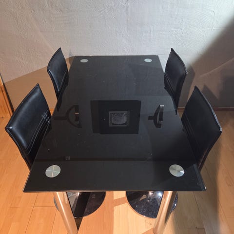 Sittegruppe med uttrektbart bord i matt, svart aluminium med bordplate i temperert glass. 135cm (270 cm i ut trekt stand). Kjøpt på Hageland Slette Malmefjorden. Kostet over 20 000kr nytt. Brukt kun 1 sommer da det ble for stort for oss. Er blitt oppvart inn etter det. Veldig tungt bord så det står for en storm.