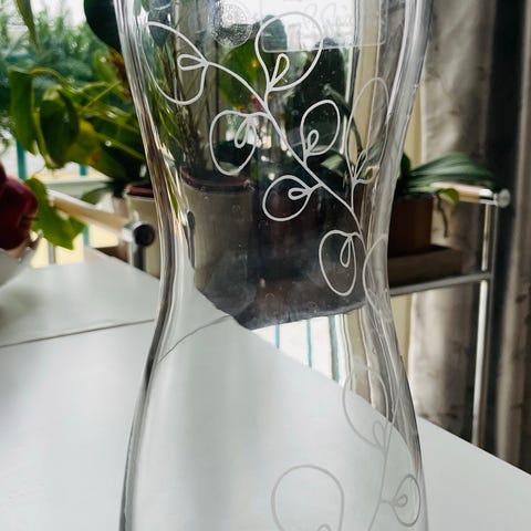 Vintage, håndlaget Ikea-vase med slipt mønster, selges for 70 kr. H=24 cm og ø=10 cm øverst. Den er designet av Barbro Wesslander og Pia Amsell. Vase med slipte fioler, selges for 40 kr. H=19,5 cm og Ø=10 cm øverst. Kan selges samlet for 90 kr. Må hentes hos meg på Langhus. Har Vipps. Søkeord: munnblåst * håndslipt * tulipaner * roser * buketter * blomster