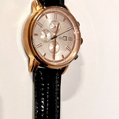 Flott Daniel Wellington 34 mm, Klassisk dameklokke i rosegull med hvit urskive og sort lærreim selges for kr 800,- Kostet ny kr 1999,- Klokken er meget pen, så vidt brukt.
