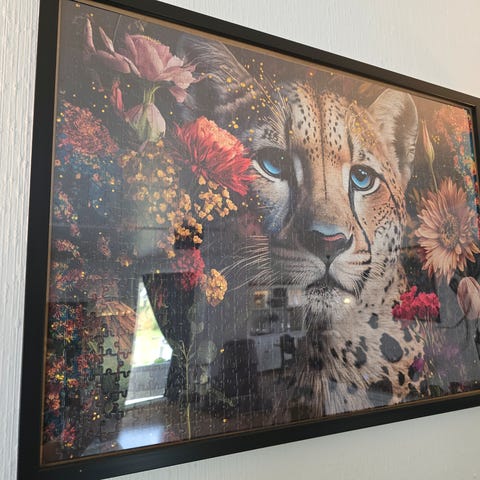 Sett med 5 dekorative veggkunstverk i rammer. Motiver inkluderer et portrett av en kvinne med krøllete hår, et Zelda-tema, et hjortehode, hender som holder babyføtter, og et portrett av julenissen. Kunstverkene har varierende farger og design, og er egnet for innendørs veggdekorasjon.