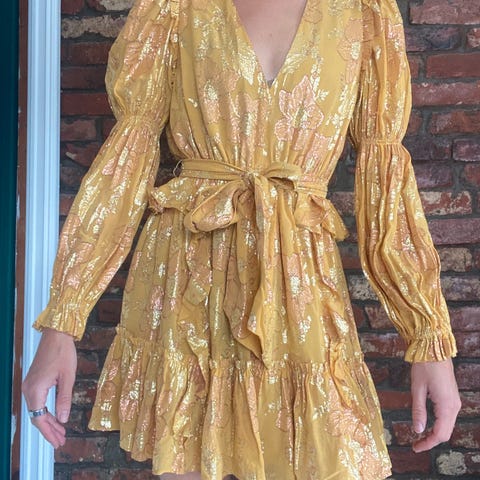 Brukt kun et par ganger. Kan brukes med stropper som knytes eller med korte ermer. Kan styles med et belte i livet også. Kjolen passer str M/L.