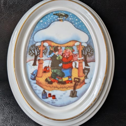 Porsgrund Porselen. Håndverks studio, design Kari Grossman. Ovalt porselensbilde med oval, profilert ramme. Rammen har en gullstripe. Se bilder for detaljer og mål. I god stand.