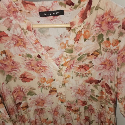 Lekker og frisk kjole i str L. Polyester og elastan. Måler 55 cm × 2 ua - ua og den kan og strekkes og vil si den er god i størrelsen. Vide ermer m/ strikk.. livlige og freshe farger. Kommer fra PIECES og er så å si ubrukt.