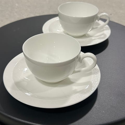 To fine hvite espressokopper med skåler, i serien 24 h (Arabia).