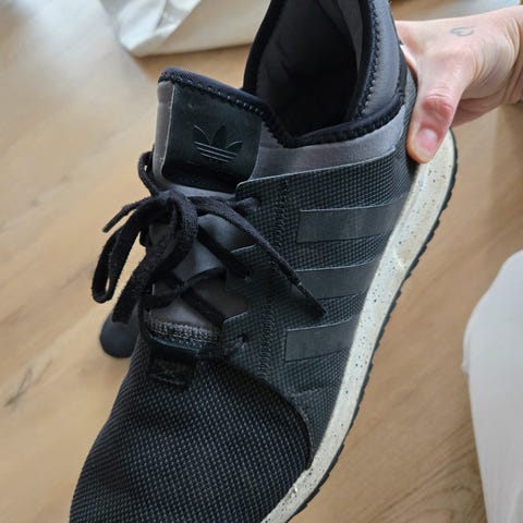 Helt nye og ubrukte sko, Esken er dessverre ødelagt da den ble klemt sammen av junior som tråkket på den, men skoene er i helt ny tilstand.
