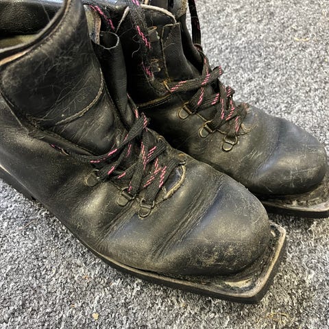 Skisko i solid lær produsert 2002, nesten ikke brukt str uk 9,5. innvendig lengde ca 27 cm. Passer til Rottefella binding/NNN. Stiv såle.