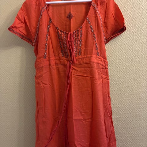 Brukt 1 gang, 74% viskose og 26% polyester. Løs passform, kappe nederst og over skuldrene.