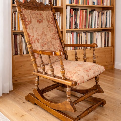 Nydelig antikk gyngestol i biedermeierstil fra midten av 1800-tallet eller noe senere. Den har elegant svungne former i mørkt treverk og originalt polstret sete og rygg i klassisk tekstil med blå- og gullmønster. Perfekt til hytte, stue eller interiørsamling