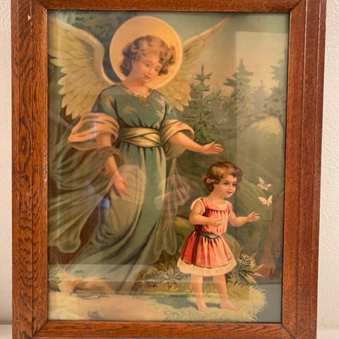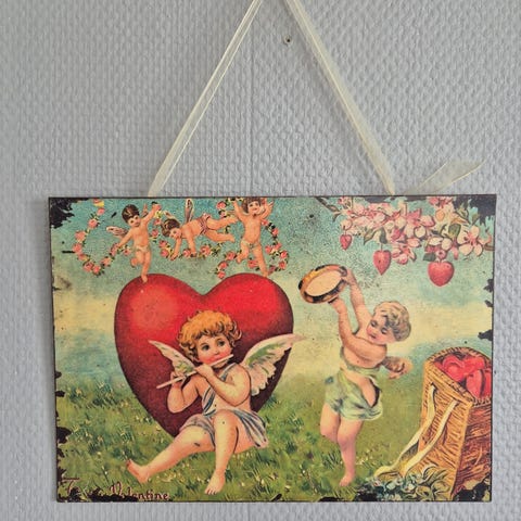 Nostalgisk vintage skilt i blikk med engler og fredsdue.