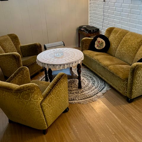 Denne er norsk produsert, kjøpt i Bergen på 60 tallet . Treseter pluss en stol.Det ble laget to av denne typen den gangen. God stand og god kvalitet. Fin mosegrønn farge med utskjæringer i treet. Tung sofa i høy kvalitet. Knag?