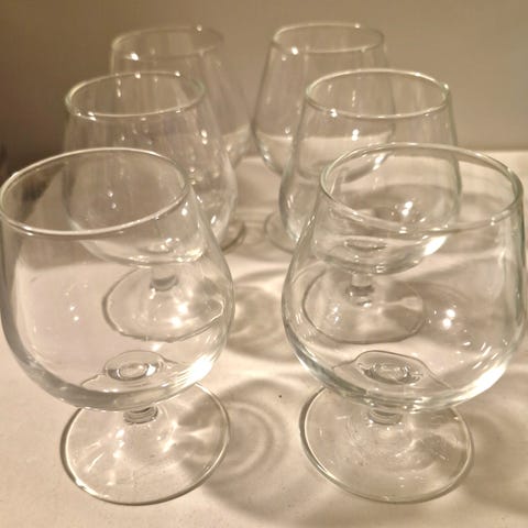 Vi selger 6 stk veldig pene retro konjakk glass. Høyde ca 12 cm.,d-5,5cm. Vi har aldri brukt dem,bare stått i skapet. Vi selger det billig, 6 stk for 299 kr.