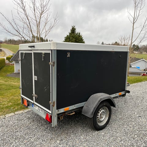Tredal offroadhenger med ekstra store hjul, tett kasse uten topplokk, frontrunner takstativ på kassa, frontrunner skuffe/slider inni kassa.