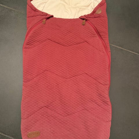 Det er tatt hull på baksiden for å feste i vogn. Med unntak av glidelås er posen hel og fin.
