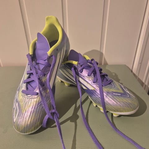 Med borrelås, enkel å ta av og på. Veier veldig lite. Fine førstegangs fotballsko.