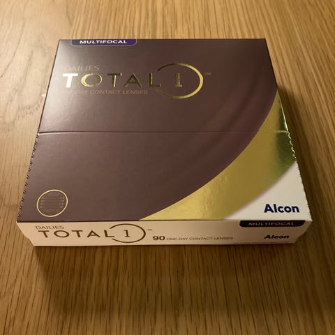 Uåpnet pakke med Dailies Total 1 Multifocal linser i styrken -1.50 medium lesestyrke.