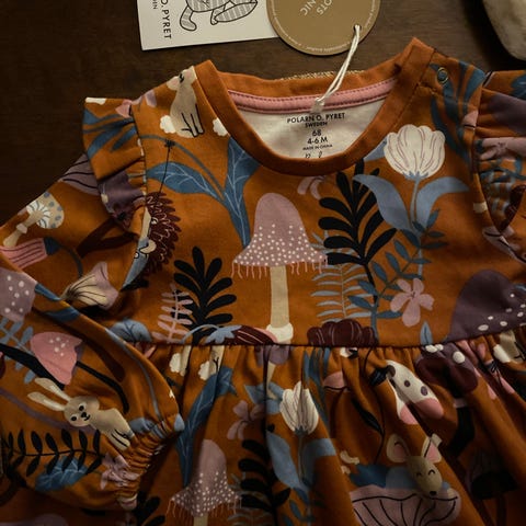 Selger jeans kjole i str 68 fra Polarn O.Pyret, trykknapper i sidet, enkelt å ta på. Søt mønstrete bomullsfór øverst.