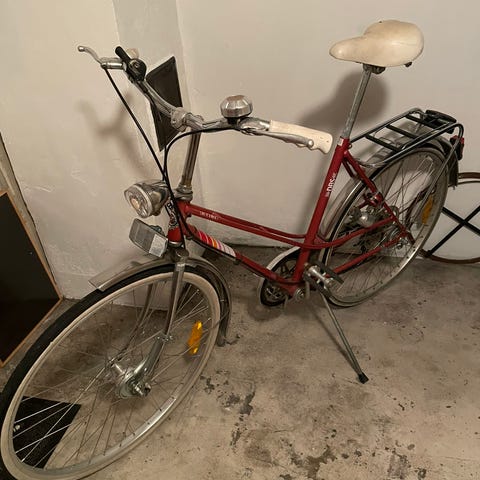 Begge dekk må byttes, og vaieren til venstre brems bør skiftes. Høyre brems fungerer fint. Ringeklokke er på, men lyden er svak.