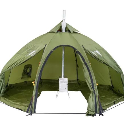 Perfekt som familietelt eller basecamp. Teltet er frittstående, enkelt å sette opp i all slags terreng og har god takhøyde takket være kuppelfasongen. Tre store innganger danner et fleksibelt fortelt for oppbevaring, matlaging eller som skjermet uteplass. Inneklimaet er godt med myggnett, justerbare ventiler og topphatt. I dårlig vær kan alle innganger lukkes, mens vinduer i forteltet gir utsyn. Teltduken er flammehemmende, og teltet kan brukes med ovn når innerteltet ikke er montert. Et komfortabelt helårstelt som tåler tøffe forhold – og gir ekstra hygge med Helsport Lavvu Stove.